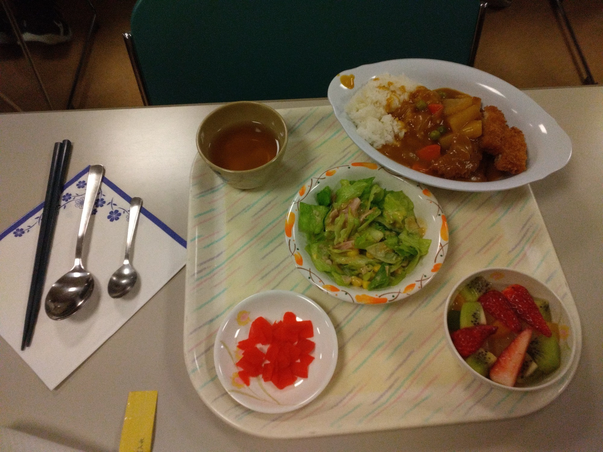 献立は、カツカレー・生野菜サラダ・フルーツ三色寒天・飲み物でした。大盛のカツカレーでしたがみなさん完食されていました。「美味しかったな!!」