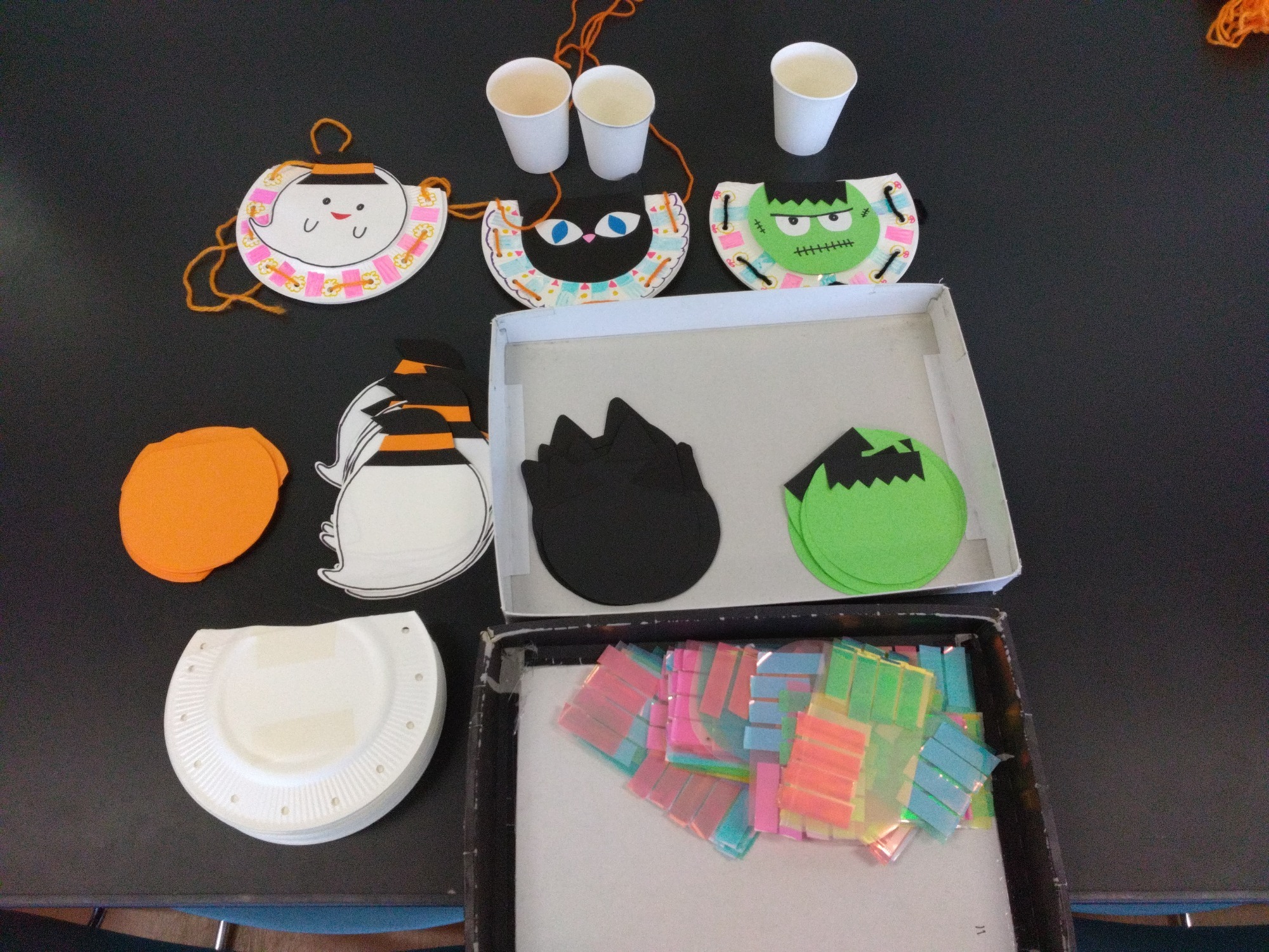 (フレンド)ジジの腕バンドと紙コップにモンスターやシールの飾り付けをしました。ジジ、可愛いですね!