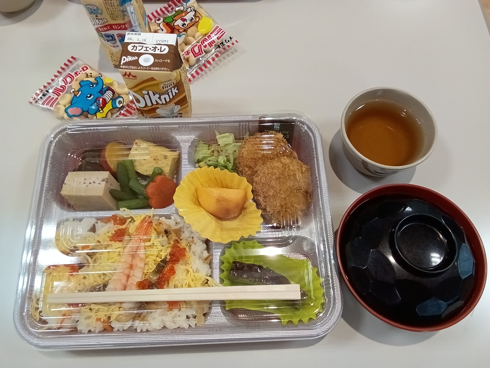 献立は、そぼろちらし寿司・きんぴら・和え物・味噌汁・プリン・ジュースです。